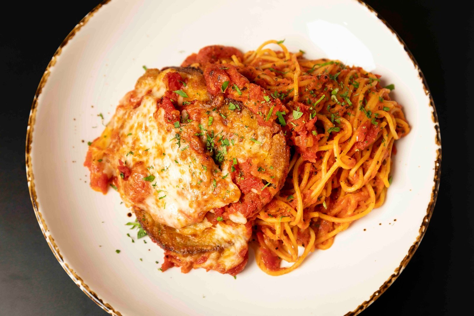 Breaded chicken, rose sauce, topped with melted mozzarella & served with spaghetti