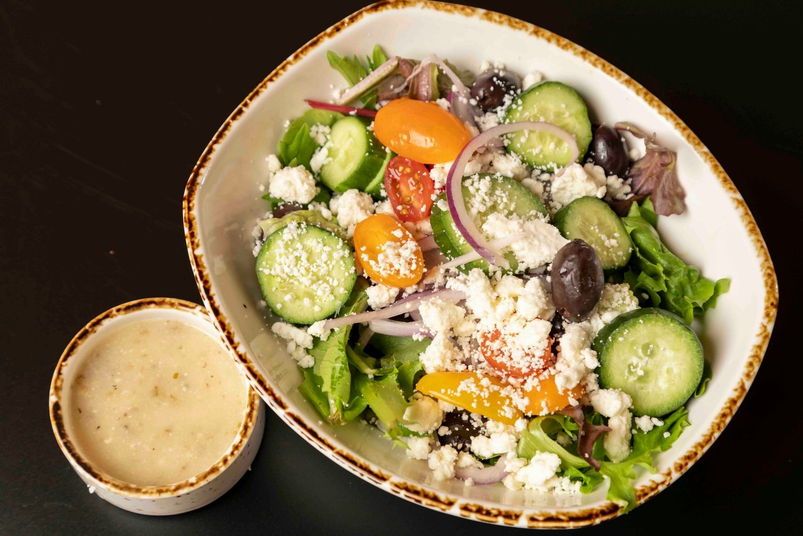 Spring mix, cucumber, grape heirloom tomatoes, red onion, kalamata olives, feta cheese, greek dressing.