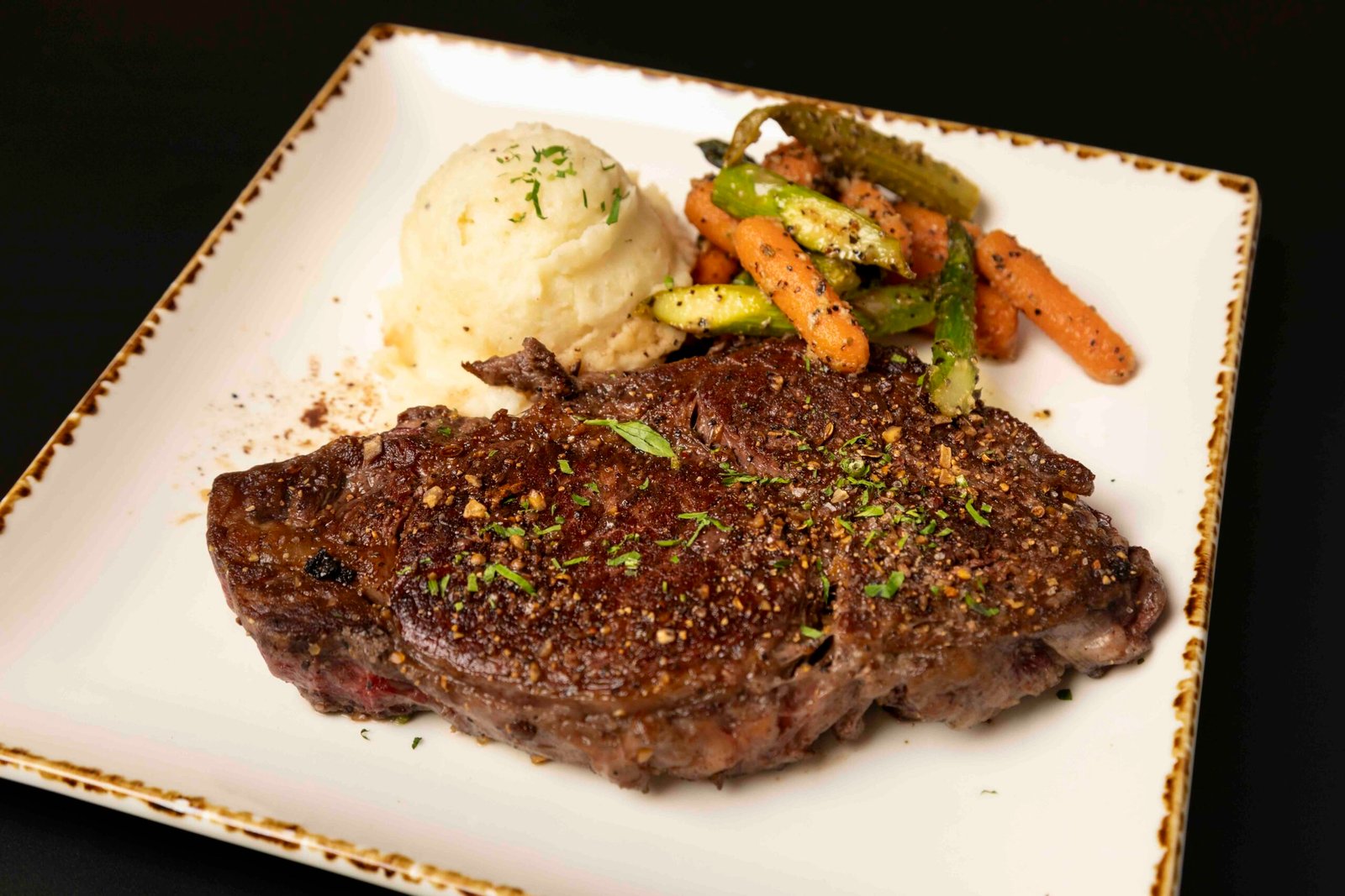 16 oz. prime ribeye steak aged for 28 days, served with mashed potatoes & grilled seasonal vegetables