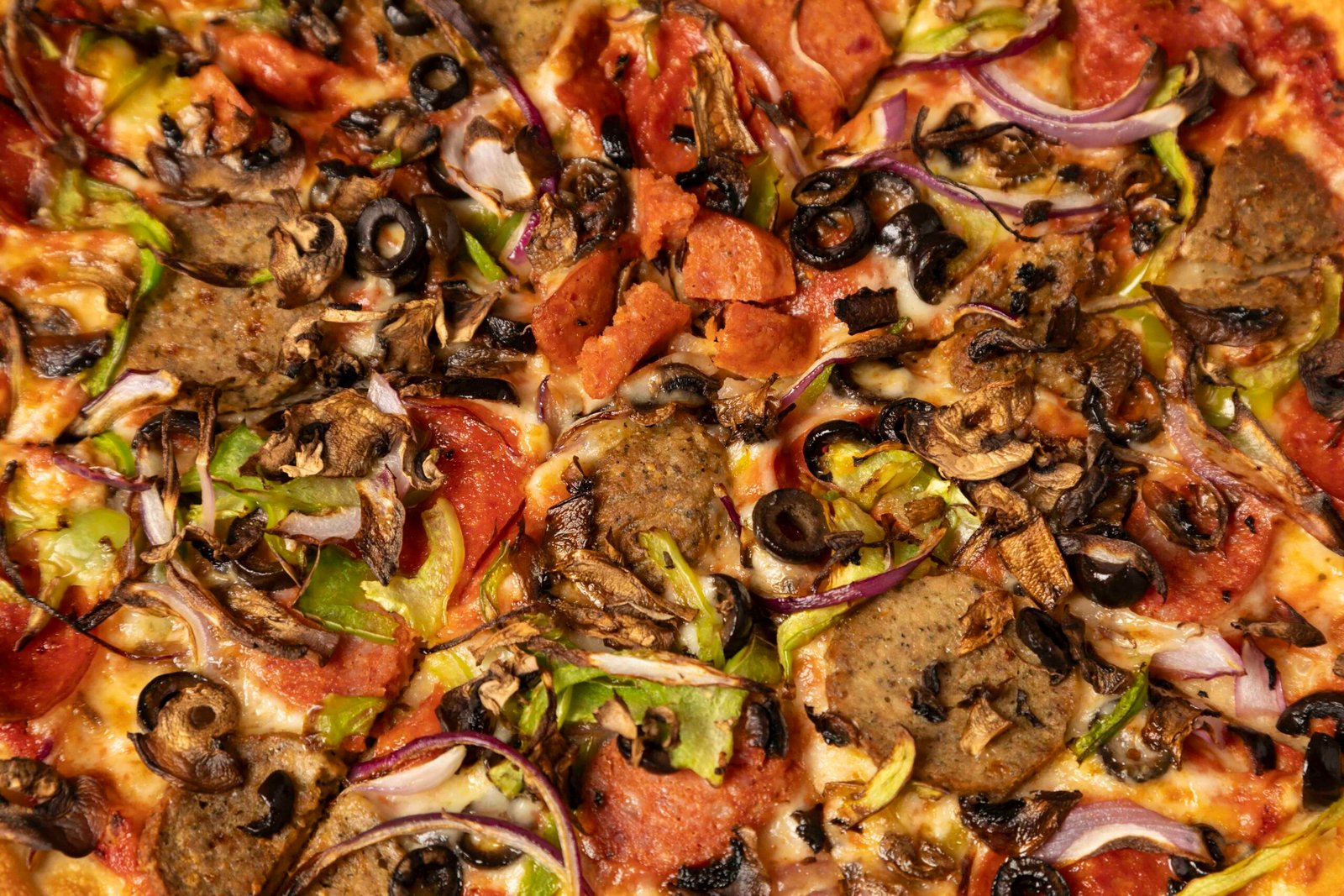 pizza sauce, mozzarella, sausage, pepperoni, meatballs, bell peppers, mushrooms, onions & olives