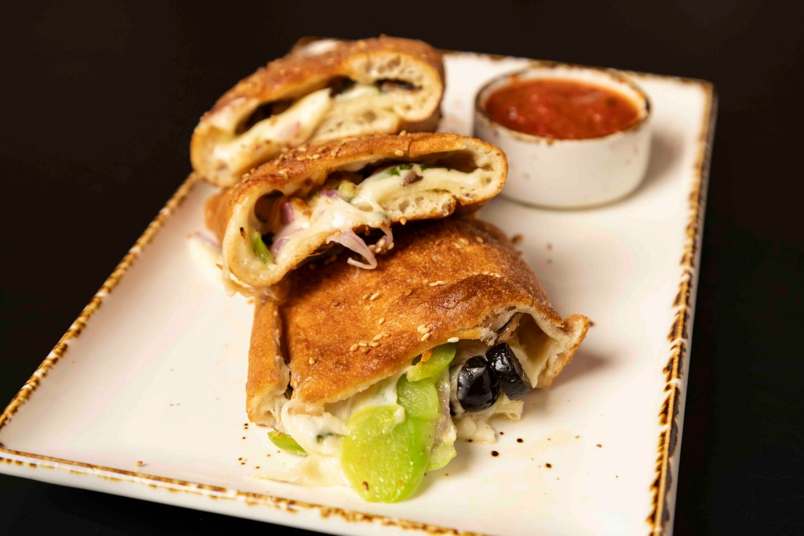 Fresh Mozzarella, black olives, spinach, mushrooms, green peppers, red onions, minced garlic & sesame seeds
